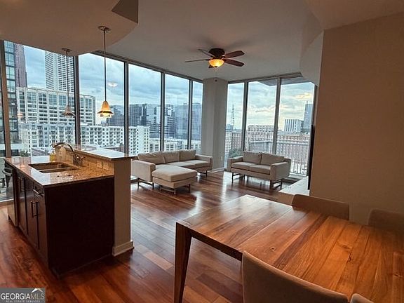 Welcome to Viewpoint in the heart of Midtown Atlanta. This 12th-floor corner unit offers 2 bedrooms and 2 bathrooms with a split floor plan and expansive floor-to-ceiling windows showcasing unobstructed south and west views of the city. The home features hardwood floors in the main living areas, carpeted bedrooms, and tiled bathrooms. The kitchen is equipped with stainless steel appliances, stone counters, a kitchen island, and a breakfast bar, opening to the living and dining areas. Both bedrooms have walk-in closets, and the primary suite includes a double vanity and separate tub and shower. This home is partially furnished and includes a private balcony. Community amenities include a fitness center, pool, clubhouse, garden terrace, grills, and 24-hour concierge. Two assigned garage parking spaces are included. Located near Piedmont Park, the BeltLine, MARTA, Georgia Tech, shopping, and dining.