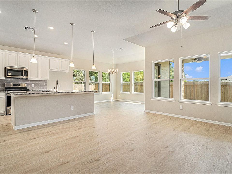 Welcome Home! This stunning home features luxurious Revwood waterproof laminate wood flooring throughout w/carpeting in bedrooms only! Open floor plan flows into the family room, lots of windows for natural light. The fabulous kitchen w/42" cabinets, custom backsplash, granite countertops w/undermount sink, and an oversized breakfast area. Fully fenced yard w/covered patio - perfect for outdoor gatherings. Relax in the spacious primary suite with a vaulted ceiling, complete with a primary bath offering double sinks, soaking tub with separate shower and large walk-in closet. Additional bedrooms w/walk-in closets w/plenty of storage. Front, sides and backyard have been sodded and front & back 6 zone sprinkler system included! Located in the desirable Conroe ISD with a SUPER low tax rate, this home won't last long! Don't miss out - call today to schedule your showing!"