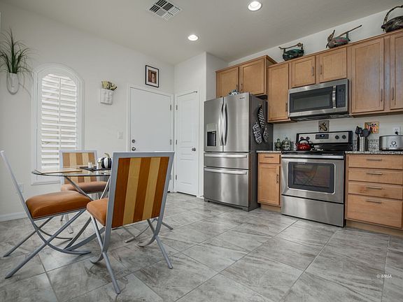 Like new well maintained home. Attractive stain resistant pavers on driveway & walkway to front entrance. Lots of upgrades: stone accent fa ade, upgraded modern tile throughout (No Carpet), bay window in main bedroom, dimmers throughout, plantation shutters in caf , great room, main bedroom & 2nd bedroom, walk-in shower in main bathroom, ceiling fans in great room, main bedroom & 2nd bedroom, granite countertops in both bathrooms and granite countertops in kitchen. Price includes the washer & dryer and all kitchen stainless steel appliances, including an expensive stainless steel refrigerator with french doors & 2 bottom drawers. New water heater installed in March 2022 and new Microwave installed in May 2022. Beautifully landscaped backyard has a covered patio that's extended with an attractive pergola that has lights and pull down solar shades. Price also includes patio furniture, BBQ and lots of lovely pots & plants valued at over $2,000. Must see to appreciate. Sun City's amenities includes a 30,000 SF clubhouse, fitness room, indoor & outdoor pools and spas, 18 hole putting green, bocce, tennis and pickleball courts. Discounts at Conestoga Golf Club and 1880 Grille Restaurant.