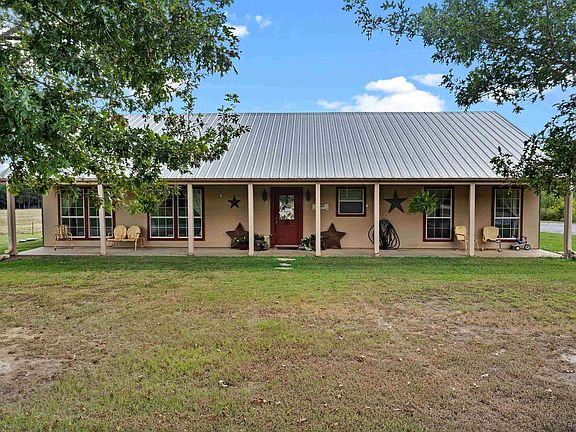Peaceful Country Living Meets Modern Barndo Charm on 9+ Acres. Welcome home to this stunning 4-bedroom barndominium nestled on over 9 acres of beautifully maintained land — complete with a stocked pond, fully fenced pastures, and all the extras for a true country lifestyle. Whether you’re raising show animals, keeping horses, or simply craving wide-open space, this property has it all. Inside, you’ll find polished diamond-cut concrete floors, custom concrete countertops, and a concrete fireplace hearth with built-in storage boxes — the perfect blend of rustic durability and modern design. The vaulted ceiling with exposed wood beam creates an airy, open feel, and the split floor plan offers privacy for the spacious primary suite. Natural light pours through the home, highlighting its open-concept layout that’s ideal for gatherings and family living. Step outside to enjoy front and back covered porches, a large carport, a cedar playhouse, and a fenced garden area — which could easily double as the perfect chicken coop setup. Cast a line in your very own pond offering perch and brim for your catch of the day, or relax while your cattle or horses graze the lush, income-producing hay pastures. A separate building on the property offers water, electricity, sewer, and laundry — currently used as an office but ideal for guest quarters, in-law space, or hobby studio. It even includes a 30-amp RV hookup for visiting guests. Recent updates bring peace of mind with a new HVAC system, water heater, septic lines, aerobic system, fencing, and spray foam insulation. With an Ag exemption already in place, you’ll enjoy low taxes and low stress — and speaking of peaceful, your closest neighbors are guaranteed to be quiet forever (yes, the small, well maintained cemetery next door means no noisy parties!). If you’ve been searching for the perfect blend of modern comfort, rural functionality, and serene surroundings — this turn key ranch ready home on 9+ acres is the one. Call for your private tour today!