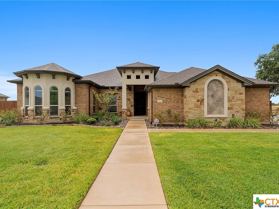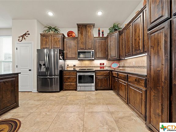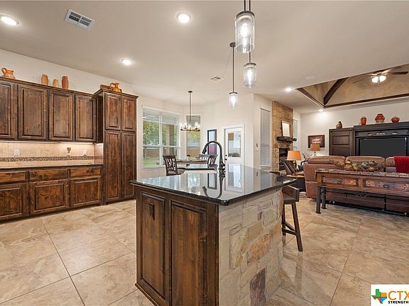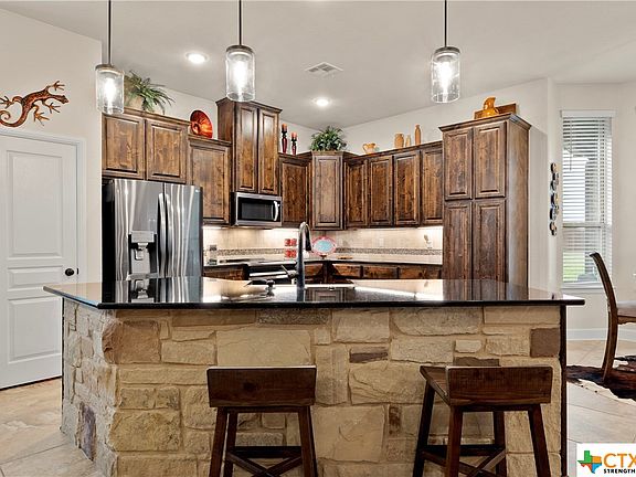 Home in the beautiful neighborhood of Spring Creek. Elegantly rustic with an architectural flair, this home brings a taste of Tuscany to Salado, Texas. Grand ceilings with wooden beams are a show-stopper. Kitchen features a farmhouse sink, stainless steel appliances, and sleek light fixtures. Natural light and recessed lighting make the interior nice and bright. Open concept living/dining/kitchen area and split-bedroom floor plan are ideal for family or guests. Spacious primary suite offers wraparound closet and dual vanity setup, as well as a garden tub and stand-alone, seamless glass shower. All secondary bedrooms include their own walk-in closets. Spacious backyard is privacy fenced and offers two grilling stations (one gas and one charcoal). Relax under the trees of the backyard’s unique sitting area while you read a book, birdwatch, or watch the horses ride by on the acreage behind. Washer & dryer, refrigerator, outdoor TV, and outdoor rocking chairs convey.