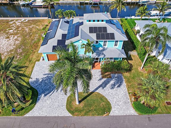 This waterfront home delivers the space, build quality, and location serious boaters want. Solid CBS construction, full impact glass, and over 4,000 sq ft of bright, well-designed living space with the primary suite, office, and billiard room on the main level. The deep-water dock offers a 20K lift, 50-amp service, and capacity for a 65+ ft vessel with quick access to the Intracoastal and both inlets. Inside, the chef's kitchen, open layout, and natural light create an easy, coastal flow ideal for everyday living. Outside, enjoy a screened pool, large lanai, and wide canal views. Fully off-grid with 76 solar panels and a Tesla charger, this property combines modern efficiency with laid-back Florida living. A rare, high-quality waterfront opportunity.