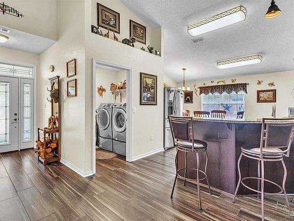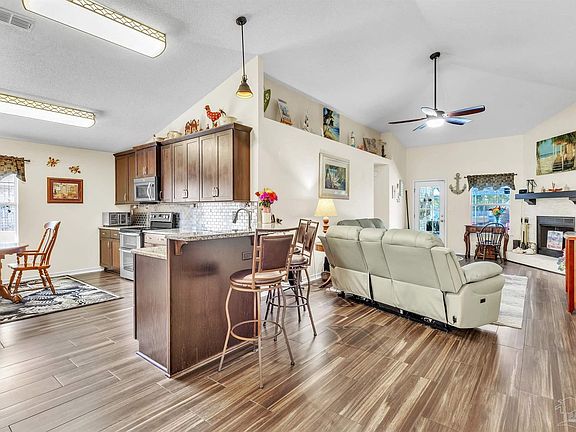 Welcome home to this beautifully updated property with space for everyone! No HOA in this neighborhood! One mile to Navarre Bridge - the BEACH is just MINUTES away! This thoughtfully designed home offers 4 true bedrooms plus a versatile bonus room—perfect for an office, formal dining room, playroom, or even a 5th bedroom. Step inside to find wood look tile flooring throughout the main living areas paired with soaring ceilings that create a bright, airy feel. The open kitchen is a chef’s dream with soft-close cabinetry, granite countertops, metal tile-look backsplash, under-cabinet lighting, pantry, and a full suite of Whirlpool stainless appliances including double ovens, microwave, and four-drawer refrigerator. The spacious great room centers around a tumbled marble wood-burning fireplace and flows seamlessly to the outdoor living space. Your own backyard oasis awaits with a completely screened pool and lanai—perfect for year-round entertaining without worrying about mosquitos. The split-bedroom layout offers privacy for the primary suite, which overlooks the pool and features an updated bath with double vanity, glass-door shower, garden tub and plenty of storage. With fresh updates, tile flooring, flexible living spaces, and a no-maintenance screened pool, this home is 100% move-in ready and perfect for today’s lifestyle.