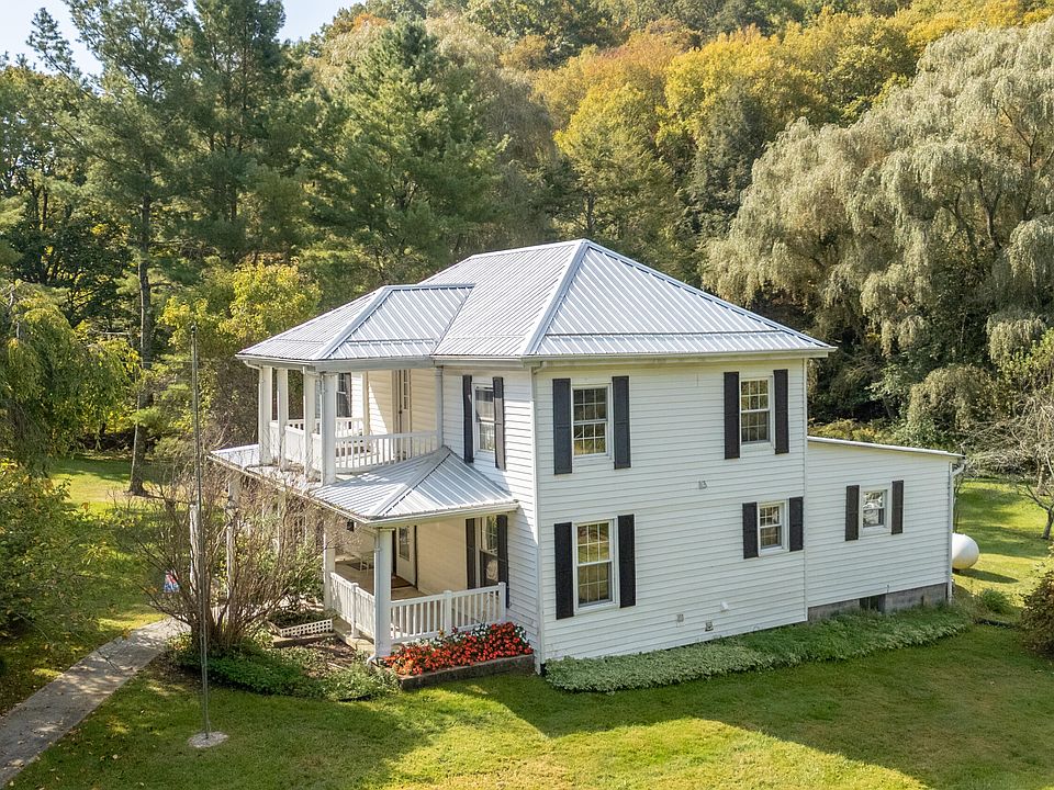 Large covered front porchWhite vinyl sidingDurable metal roofBlack shuttersTwo large upstairs bedrooms