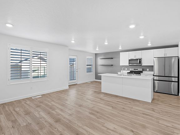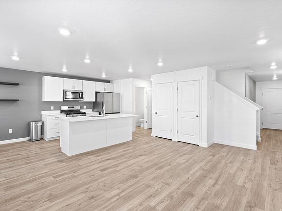 Basement walkoutWalkout daylight unfinished basementMountain backdropUpgraded laminate flooringWhite cabinetsRecessed lightingStainless steel appliances