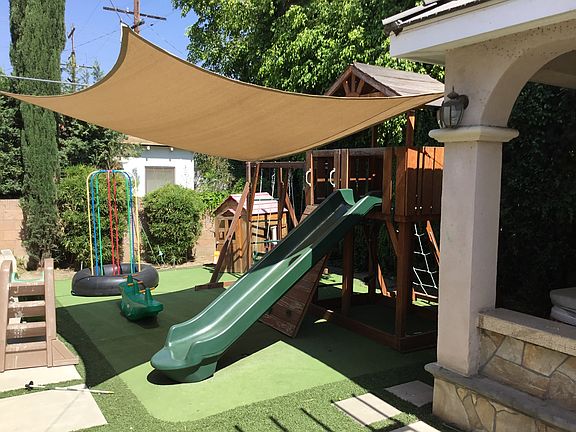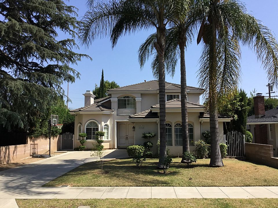 Beautiful north facing home in *SAN MARINO SCHOOL DISTRICT* is located on a charming tree-lined street. Enter through the welcoming double doors into the foyer to find a bright and airy home. Living room features a classy chandelier and fireplace. Newer floors in living room, dining room, and den. Formal dining room also features a chandelier and is adjacent to the kitchen. Kitchen, family room, and living room all have beautiful views of the backyard. Backyard features putting green and wonderful pergola and covered area with built-in spa and built in bbq; perfect for relaxing and/or for entertaining. One bedroom conveniently located downstairs. Head upstairs with the stunning spiral staircase to find 3 bedrooms. Master suite features a walk-in closet and large bathroom with soaking tub and shower. Two-car finished garage has direct access into the home which offers convenience. This home is ready for new tenants to enjoy all the amenities it provides! Owner pays for gardener. call regarding pets; there may be pet deposit