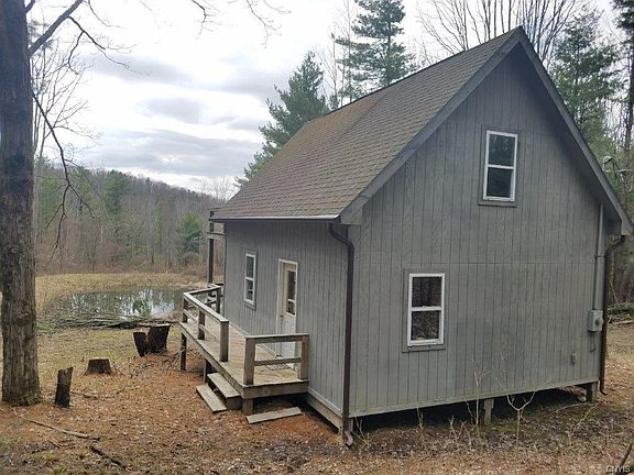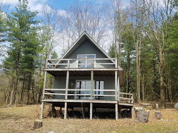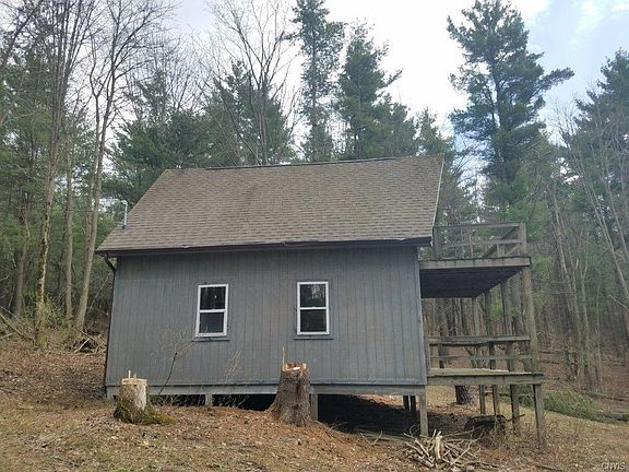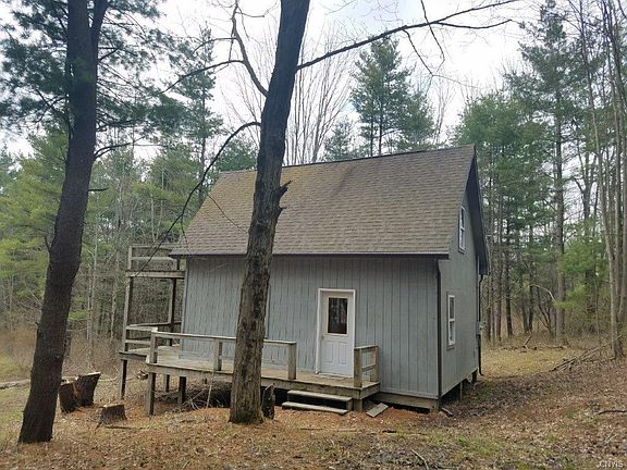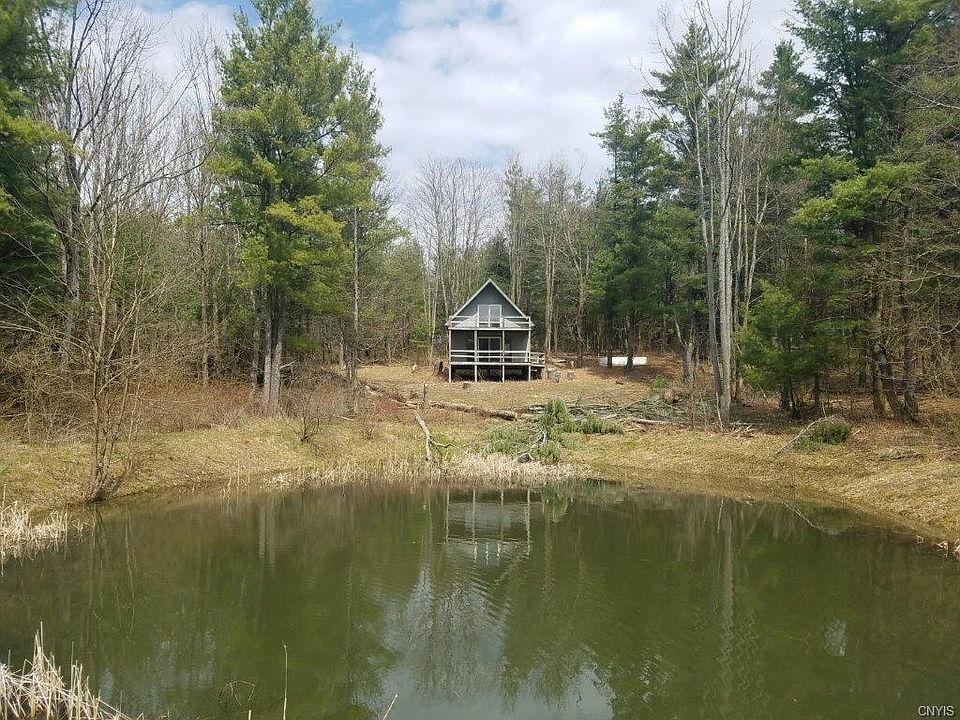 Located on a dead end road near state land, a very peaceful and private location with a two-story chalet awaits. Established in 2000, the well-built shell with existing electric is ready for a new owner to customize the work that has been started. Enjoy your morning coffee with views of the pond and wildlife on the upper and lower decks featuring sliding glass doors. Situated in the township of Urbana, provides access to the Keuka Lake boat launch, conveniently located 3 miles away in the Village of Hammondsport. The corner lot comprised of 3 surveyed parcels on a year-round maintained, gravel road includes 2 separate entrances. Plenty of wildlife sign and habitat on the 15 acres of primarily timber, a mix of conifers and hardwoods with several large red oaks. The wilderness lot provides the ultimate seclusion. Get away from your busy work life and make this your own personal retreat or hunting camp.