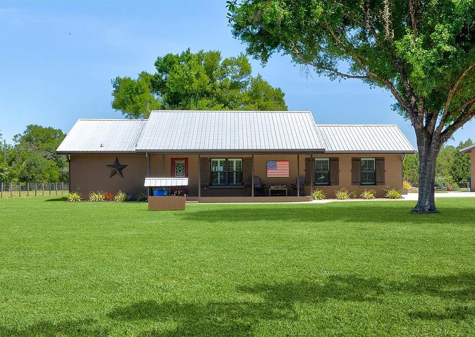 Welcome to your country sanctuary, just a stone's throw from the vibrant community of Lakewood Ranch, FL. This stunning custom remodeled home is a testament to fine craftsmanship and meticulous care, offering unparalleled luxury on 5.05 acres of serene land nestled at the end of a quiet dead-end road. This Ranch-style home features a thoughtful split floor plan designed for modern family living. Step inside to discover a sprawling open kitchen adorned with maple cabinets, stone backsplash walls, and stainless steel appliances. The massive island with a stove and drop-down counter invites gatherings and culinary adventures, while the adjacent dining area with custom-made arch windows sets the stage for memorable meals. Metal roofs on the structures ensure your safety and their longevity to provide you not only with physical comfort, but financial peace of mind as well. Your master suite is designed with comfort and aesthetics in mind, with shiplap accents, double ceiling fans, and ample natural light pouring through the windows. The ensuite bathroom is a spa-like retreat, showcasing shiplap walls, a custom porcelain tile shower, an over-sized freestanding tub overlooking the pasture, and double vanities. Entertain guests in the open-concept living room or retreat to the expansive family room, complete with french doors and hidden TV cable hookups for seamless entertainment. The home also features two freshly remodeled bedrooms and a second bathroom with exquisite porcelain shower tile. Every room comes complete with their own custom plantation shutters. Outside, indulge in the Florida lifestyle with a custom paver stone fire pit, perfect for cozy evenings under the stars. The property is fully equipped with a 4-car detached concrete garage with a built-in workshop with plenty of high voltage hookups for tools and toys, RV canopy carport, chicken coop, large horse pasture, and a 3-stall barn with a feed room for the equestrian lovers out there. Enjoy the convenience and of water collection rain barrels, water lines and spigots in the garden area, along with mature Grand Daddy Oak trees adding that true Southern charm. Property is located high and dry - totally unaffected by flooding and hurricane damage from Ian & Debby. Located within reach of the coveted Terra Nova Equestrian Center, Siesta Key's sugar sand beaches, St. Armand's Circle, and Lido Beach, this home offers the perfect blend of rural tranquility and urban convenience. Whether you're seeking a country homestead or simply craving space to roam, this 5-acre property is just close enough to town in the coveted Lakewood Ranch area for easy access to shopping, entertainment, dining, and so much more, yet still promises a lifestyle of open land, freedom, and privacy. 3D Walk-Thru Available (See MatterPort Link)