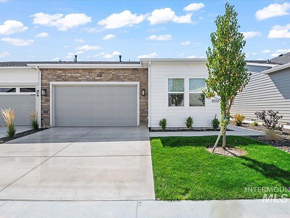 Better than new! This stunning 2 bedroom + office, 2 bathroom townhouse is less than one year old and showcases extensive upgrades throughout. Located in the highly desirable Milestone Ranch 55+ community in Star, this home offers LVP flooring throughout, upgraded light fixtures, natural woven designer blinds, and premium appliances. The kitchen features upgraded cabinetry, a built-in gas cooktop, oven, microwave, wine cooler, and included refrigerator. The primary suite offers a full tile walk-in shower, dual vanity, elegant finishes and a large walk-in closet. Step outside to an oasis featuring extensive landscaping, turf and a large covered patio. Milestone Ranch residents enjoy resort-style amenities including indoor & outdoor pools, pickleball courts, fitness center, group classes, and a luxury clubhouse with a dedicated social coordinator curating events and activities. The perfect opportunity to own a beautiful home in one of Star’s most vibrant 55+ communities!