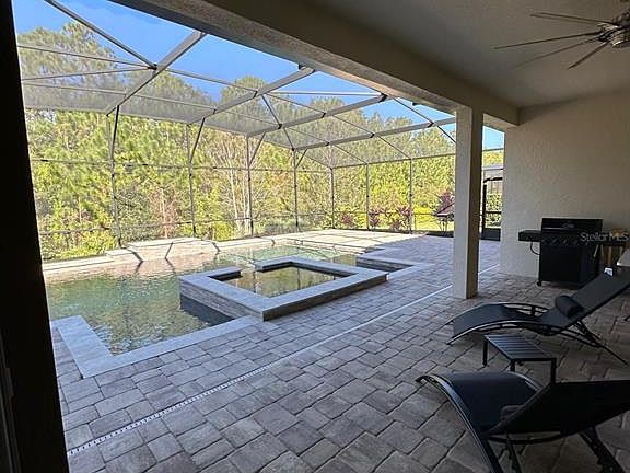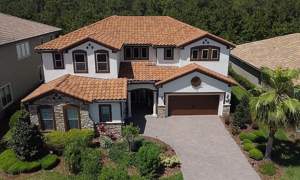 The 8556 Adalina Pl is a stunning, luxurious 4,831 SF living area of a 6,536 SF Total building area 'Portside' model home from builder Pulte Homes, five-bedroom, three full and two half baths, two-story, located on conservation grounds and with a large wooded area behind the house. This house is in Enclave at Village Walk, a gated community in Lake Nona, with an oversized master bedroom suite, a formal dining room, a home office, as well as an open kitchen/gathering room on the first floor. The gourmet kitchen features a massive center island, high-end stainless-steel appliances such as the double wall oven and natural gas cooktop, a KitchenAid oversized stainless steel French door refrigerator, a butler’s pantry, a walk-in storage pantry, an island, and café seating. The home’s gathering room features a wall of glass sliders that completely open the home to the outdoor living space with panoramic views of the large lanai covered and custom-built heated saltwater pool, spa fountain, and private conservation area. Upstairs are four guest bedrooms, two full baths – perfect for modern family living and entertaining relatives and friends. The enclave residents through the HOA enjoy free amenities such as a gated community, complete lawn care, internet, cable, security, and a sprinkler system. In addition, the Village Walk Community offers the Enclave residents a beautiful Lap Pool, Resort Style Pool, 24-hour State of the Art Fitness Center, lighted trails, scenic bridges and canals, salon, Tennis Pavilion, several lighted tennis courts, basketball courts, lakeside gazebo, gas station, coffee shop and deli market, post office, game room, and multipurpose room big enough for family gatherings, with a 24-hour guard. Residents are a short drive away from Medical City, educational institutions, Orlando International Airport, KPMG Lake House, Disney, Universal, SeaWorld, USTA's state-of-the-art 100-court tennis facilities, and new Orlando City Soccer training facilities. This house is zoned for ‘A’ rated schools such as Village Park Elementary, Lake Nona Middle & High School, and is convenient. If the new owner desires the present tenant to continue with the present $5,900/month rent through the current lease ending on March 20, 2026, or otherwise vacates when the sale occurs. Even if the new owner desires to keep the tenant beyond the present lease expiry in March 2026, then the tenant wishes to continue, the new owner and the tenant can discuss. The Brown painting (garage doors, windows, and trim) warranty is transferable to the new owner, and the company number will be provided to answer any questions. The nice, long Living Room and Eat-In Kitchen drapes/curtains were preserved by the tenant in the garage, and those will be available to the new owner at no cost, if desired. Along with the appliances Washer and Dryer also convey.