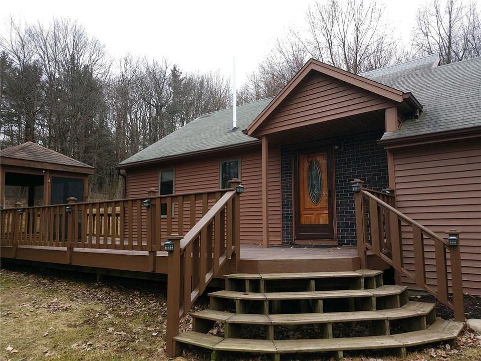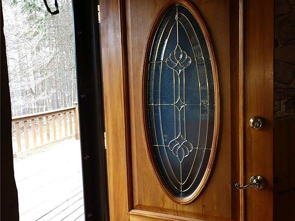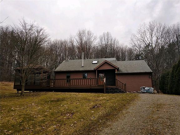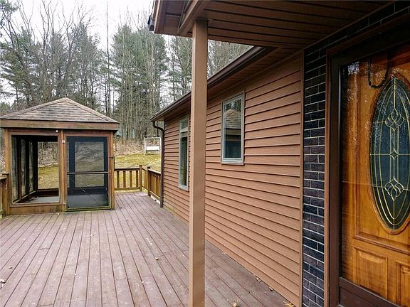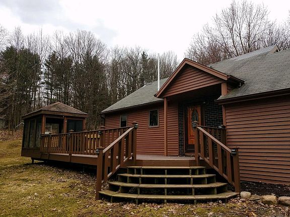 Contemporary Post & Beam home on almost 3 acres set back off the road. The front is enhanced by a 12x41 deck with a screened in gazebo. Warm & inviting interior with natural wood & flooded with sunlight. Gleaming Hardwoods. First floor laundry. The Kitchen was updated with Corian counter tops an undermount sink & faucet and a built-in buffet station. The formal dining room boasts a windowseat, woodburning stove and a wall mural that brings the feel of the outside in. Huge vaulted ceiling family room w/ slider leading out to a backyard patio & updated powder room w/ storage closet. Two bedrooms on the first floor. The second floor has a loft-like feel and skylite. The 24x32 pole barn has a concrete floor.