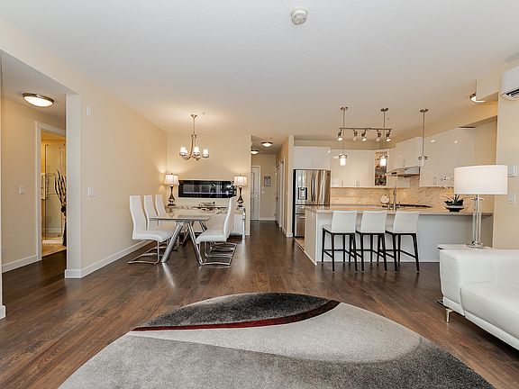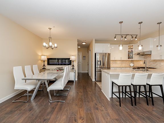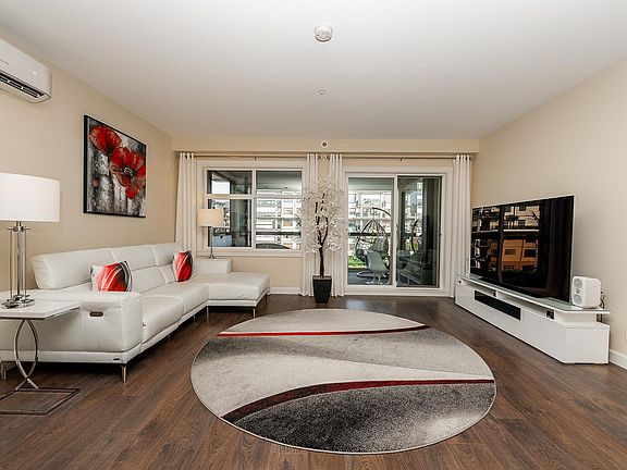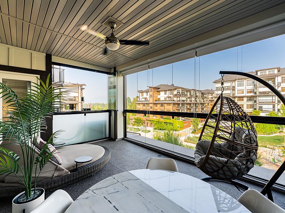 Immaculate and spacious East-facing 3 bedroom + den at sought-after Yorkson Park! Offering 1,583 sq ft of bright and air conditioned living space, plus a 225 sq ft solarium/balcony with retractable glass panels and courtyard views. The gourmet kitchen features a peninsula with seating, gas range and sleek cabinetry, seamlessly connecting to the dining and living area. Designed for year-round enjoyment, the solarium expands your living space. Generous bedrooms include two with luxurious ensuites, double vanities, frameless glass showers, walk-in closets, and access to the solarium. Added features include an energy-efficient heat pump with A/C, gas BBQ hookup, 2 parking stalls, and a storage locker. Conveniently located near Carvolth Exchange, shopping, restaurants, and quick highway access.