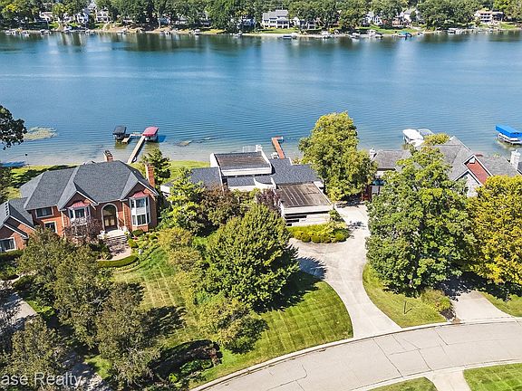 A RARE FIND!. LUXURIOUS LAKEFRONT RANCH WITH 98 FT OF SANDY SHORELINE ON PRIVATE, ALL SPORTS LOWER STRAITS LAKE! BEAUTIFUL BRICK CONTEMPORARY IS LOCATED AMONG CUSTOM BUILT HOMES IN HIGHLY SOUGHT AFTER PINE COVE VILLAS OFFERING A SUB BEACH, PARK, TENNIS & PICKLEBALL COURTS. CUSTOM BUILT HOME features an open concept, 6,551 SF of Living Space, a beautifully finished lower level walk-out, 1st floor and LL Laundry Rooms, elevated terrace with glass rail, large patio and oversized 3 car Garage. Spacious Foyer features a soaring ceiling, walk-in closet and views into multiple rooms. From the Foyer, rich hardwood flooring flows into the Dining Area featuring a built-in buffet. The Large Great Room features a 12’ ceiling, a wet bar, gas fireplace with granite surround and door-wall leading to the raised terrace. A full wall of windows extending from the floor to the ceiling provides stunning lake views! The Library includes built-in display/storage and Powder Room features a granite vanity and hardwood floor. The large Kitchen/Nook are furnished with an abundance of custom cabinetry with under/over lighting, granite counters, premium KitchenAid appliances, Island with snack-bar counter, built-in desk, hardwood flooring and door-wall to the terrace. The Sun Room features a 12' door-wall leading to the patio. The Owner's Suite features large windows facing the lake, door-wall to a private deck and built-in storage/display. The Ensuite is furnished with a Euroglass enclosed shower w/marble surround, jet tub, vanity w/marble counter and marble floor. The private retreat includes His & Her walk-in closets w/built-in organizers & Dressing Area w/make up vanity. The LL includes a huge Family/Rec Room featuring a wall of windows facing the lake, a door-wall to the patio and a wet Bar/Kitchenette. Bedroom Suite 2 includes a walk-in closet and full Bath, Bedrooms 3 & 4 feature W.I.Cs, Hall Bath w/step-in shower and Art/Flex Room. Mud Hall with closet is located at the Garage Entry.