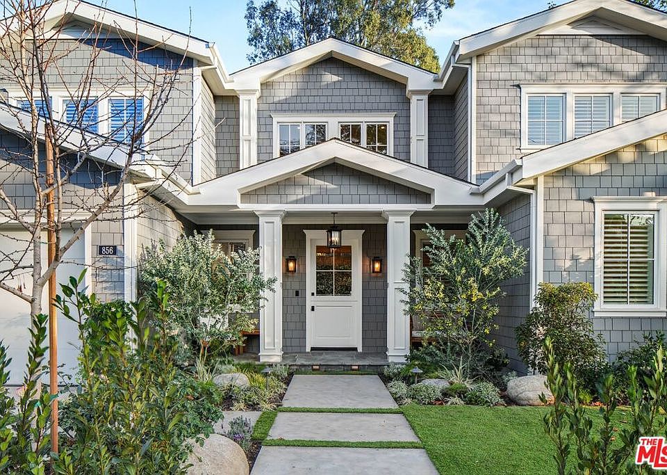 Nestled on an idyllic Brentwood cul-de-sac with access to a charming path to Crestwood Hills Park, 856 Leonard Road is a brand new Traditional home with 5-bedrooms and 5.5-bathrooms spanning 4,786 square-feet of living space. Enveloped by natural light from an entire back wall of sliding glass and thoughtfully placed transom windows, the open-plan main level features seamless indoor/outdoor flow, soaring high ceilings and top tier finishes. Two living rooms are positioned around floor to ceiling stone fireplaces with a dining area in between, and an adjacent gourmet kitchen with butler's pantry equipped with new Wolf and SubZero appliances including double ovens, two dishwashers, two fridge/freezers, refrigeration drawers, ice maker, wine cooler, and more. The expansive primary suite is uniquely positioned on the main level and has abundant closet space, a luxe en suite bath with separate shower and soaking tub, and direct access to the outdoor patio. Two secondary en suite bedrooms, including one that would make the ideal home office, and a powder bath complete the main level, while two more en suite bedrooms and a spacious family room are upstairs. For effortless everyday living and entertaining, the home's interior flows out to the meticulously manicured backyard that offers a tranquil environment with a sparkling pool and spa, multiple lounge patios, built-in BBQ, and fire pit. Other notable features include surround sound, Lutron lighting, solar panels, and an attached 2-car garage with EV chargers and a direct entrance into the home. Set just moments from Kenter Canyon School and a short drive from Brentwood shops, restaurants, and hiking trails, this stunning home offers a choice blend of modern luxury and convenience in a highly coveted locale.