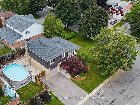 Welcome to this stunning, move-in-ready family home, thoughtfully updated with modern finishes throughout. The sleek custom kitchen features high-end appliances, quartz countertops, a large centre island, black granite double sink, abundant cabinetry, and a walk-out to a brand-new deck. The open-concept layout flows seamlessly into the combined living and dining areas, ideal for entertaining. Three spacious bedrooms include a primary bedroom with an updated semi-ensuite. The second family room offers a walk-out to a private backyard oasis complete with an above-ground pool. The clean, unfinished basement includes laundry and ample storage, ready for your personal touch. Beautiful curb appeal with large, manicured corner lot and no sidewalks. Prime Whitby border location close to highways, top-rated schools, parks, and all amenities. Roof (17), Windows (18), Siding/insulation (18), Furnace (19), Tankless Water Heater (19),AC (22), Fence/deck 2025. Nothing to do but move in and enjoy.