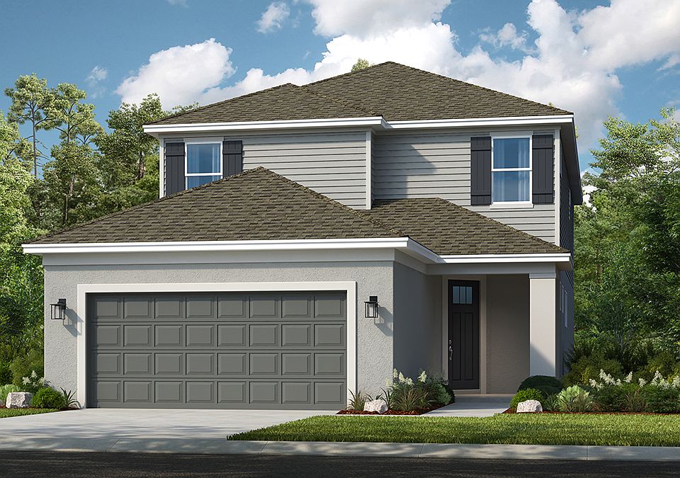 Welcome to the Anastasia at 8560 Snowfall Street in Skye Ranch. This spacious floor plan is thoughtfully designed for relaxed Florida living. A welcoming foyer leads to a bright laundry room and a convenient half bath. At the heart of the home, the designer kitchen opens to a cheerful dining area and a sunlit great room-perfect for everyday moments and entertaining alike. French doors frame a cozy study, and the lanai just beyond the great room invites you to enjoy breezy evenings outdoors. The private primary suite features a generous walk-in closet and a spa-inspired bath with dual vanities and an oversized shower. Upstairs, a loft and game room offer space to unwind, along with three additional bedrooms-one with its own full bath and two sharing another. Additional Highlights include: Pocket sliding glass door, gourmet kitchen, 8ft interior door upgrade, game room, wood like tile, white cabinets and quarts countertops. Photos are for representative purposes only.