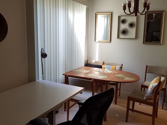 Second floor fully furnished 1 BR condo in the Villa La Jolla complex near UCSD. Furnishings include bed, dining set with 5 chairs. over-range microwave, dishes, glasses, pots & pans, silverware, sofa, desk and chair, lamps, wall-mount flat screen, Ninja air fryer, toaster, vacuum cleaner, iron and ironing board, hair dryer, etc. Unit has electric range (no gas) and has large balcony with small storage closet. Water bill included in the Home-Owners fee (no meters). Kitchen has quartz countertop, double sink, pull down faucet and lots of storage. Condo complex has swimming pool with hot tub and small exercise room; laundry on site. One assigned covered parking space. 1 year lease and security deposit equal to 1 month's rent