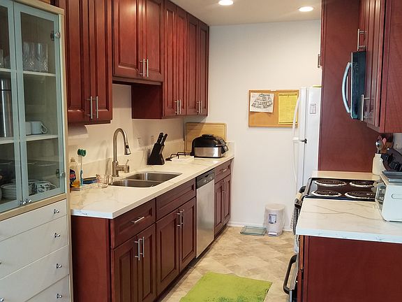 Large balconyPull down faucetQuartz countertopElectric rangeDouble sink