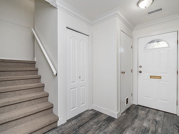 Sleek laminate flooringElegant fixturesFresh paintPot lightsCrown mouldingGorgeous kitchenBright eating area