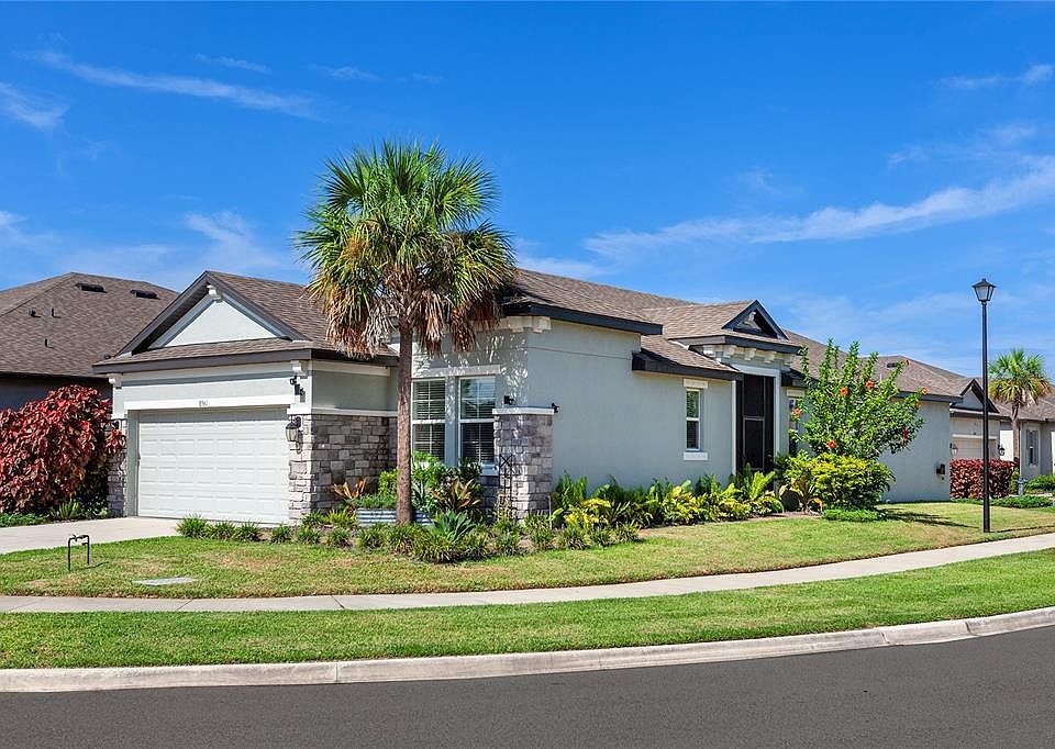 Welcome to 8561 Whispering Street, a 3 bedroom, 2 bath, 2 car garage home in family friendly Hidden creek. Built in 2019, this well designed home has an inviting open floor plan featuring a spacious kitchen and separate dining room. Enjoy morning coffee or evening relaxation on your screened-in lanai, surrounded by the serenity of your corner lot. The kitchen and baths feature elegant quartz countertops, tile flooring flows through the main living areas, and both the great room and primary suite boast tray ceilings that add an extra touch of charm. The primary suite boasts a private ensuite bathroom, spacious walk in closet, and a tray ceiling. Two additional bedrooms and a second bathroom are perfect for guests or a home office. Home features also include a separate laundry room with storage, 2 car garage, hurricane shutters, corner lot and private front view. Hidden Creek has sidewalks in the community, miles of walking trails, and a wonderful recreational area with a playground, BBQ grills, a covered pavilion for gatherings and birthday parties, and a multi sports field for family fun and recreation. Hidden Creek is conveniently located near the UTC Mall, Lakewood Ranch Waterside, Lakewood Ranch Main Street, downtown Sarasota, I-75, golf courses and The Pickleball Club. Centrally located to Sarasota and world famous beaches! This move-in-ready home is waiting for you schedule your showing today and discover why Hidden Creek is the perfect place to call home!
