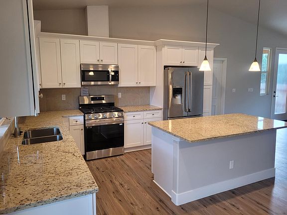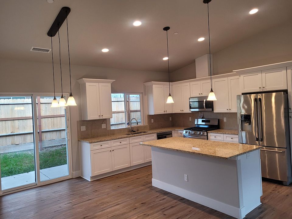 Lease this beautiful newer construction, 3 bedroom, 2 bathroom home on a large lot! Attached 2 car garage! The home features vinyl plank flooring, granite countertops, stainless steel appliances, can lighting and drop lighting in the dining room over huge island. Master bedroom has huge walk in closet and a en suite with a stunning walk in shower!! All ceilings are high and vaulted to offer tons of natural light from French doors and sliding glass doors. A refrigerator and washer/dryer are being provided as a courtesy. If they fail to operate, the owner will remove them from property and the tenant would need to provide their own. Also! Tenant will be responsible for gas, trash and electric. Owner will bill tenant monthly for electric usage. Property has an electric sub meter. Owner pays for water. This is a very private property with a beautiful oak just outside.
