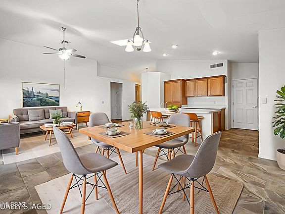 Charming, clean 2BR plus Den home in the Coves at Voyager. This tiled roofed home features stylish ceramic tile throughout. Great room with high ceilings includes island kitchen, perfect for entertaining. Updated primary bathroom. Low care front and back yard, covered patio. Roomy garage with cabinet storage. This gated community features Pool, Spa, Tennis/Pickleball Courts, Shuffle Board, ideal for the active resident. Home has had polybutylene piping replaced. Contact listing agent for your own personal showing.