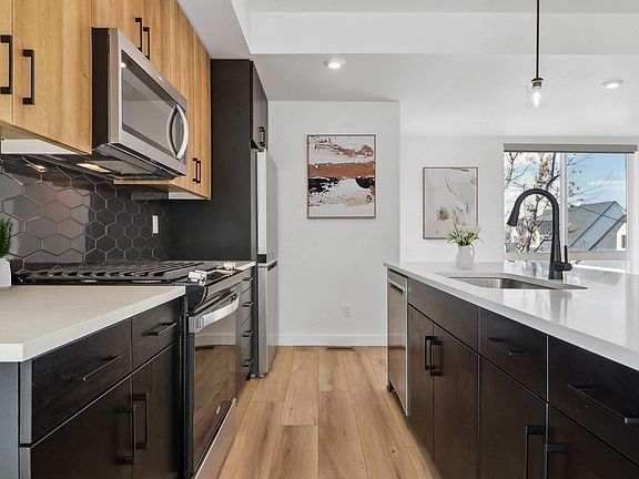 Nestled in historic Arvada, Colorado, The Emerson at Olde Town offers brand-new 2-bedroom and 3-bedroom townhomes with convenient access to Denver as well as the mountains. Each well-appointed 3-story townhome features an open-plan kitchen with stainless appliances, gas cooktops and a large island. You'll enjoy plenty of storage, the security of your own private, attached two-car garage, in-unit washer/dryer, 2nd floor balcony and endless views from your rooftop deck. Your new home is an oasis of modern luxury designed for your lifestyle featuring tongue and groove plank flooring, matte black fixtures and hardware, and European style glass showers.