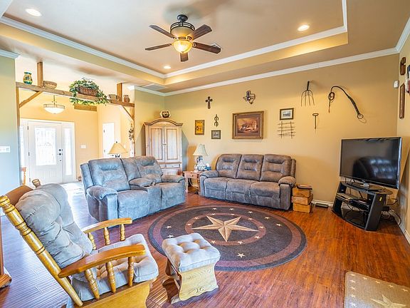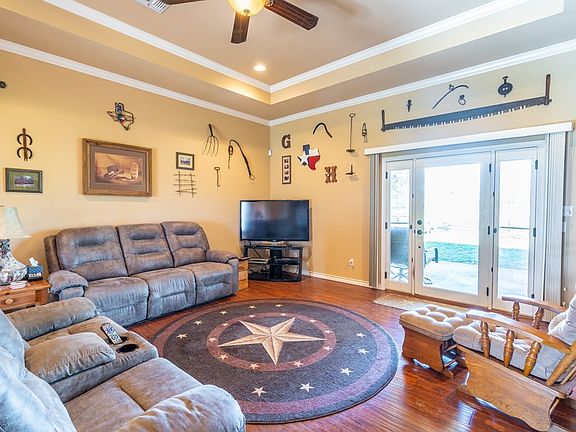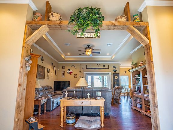Wonderful custom built 3 bedroom/2.5 bath on 9.9 acres with covered workshop/barn area. This home built in 2008 has beautiful handscraped hardwood flooring, an open floor plan and wonderful storage throughout. Enjoy the peace and quiet of living in the country with just a very short drive to all areas of San Angelo. The master bedroom is very spacious with a large walk in shower fit for a king! The master closet will certainly not disappoint either as it is HUGE and made for great storage! The island kitchen is inviting and is the perfect area to entertain family and friends with lots of cabinets and a breakfast bar. The laundry room is very large and nearly all the closets have been customized for extra storage- keeping holiday decorations up and out of sight when not needed. Nice custom accents throughout and tall ceilings with beam accents in the entry/living area. A fenced backyard and patio makes a great place for kids and dogs. Come see this slice of heaven today!