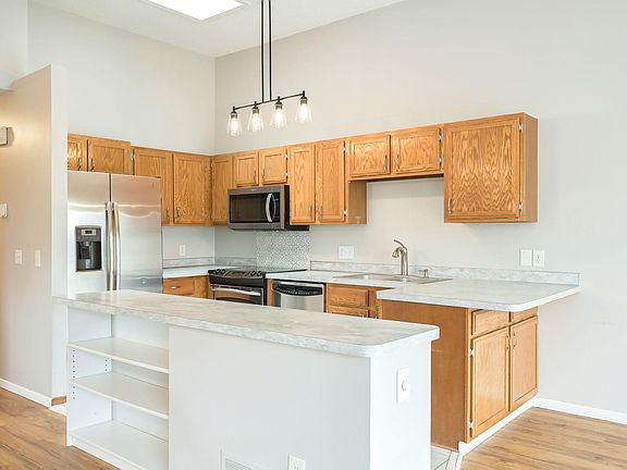 Welcome to this move in ready end unit townhome with large garage and 400sqft of westerly facing outdoor deck and patio. Newer flooring and countertops. Home is move in ready. Lower level has space to partition for a third bedroom. Located within close proximity to parks, lakes and shopping. Photos have been digitally staged.