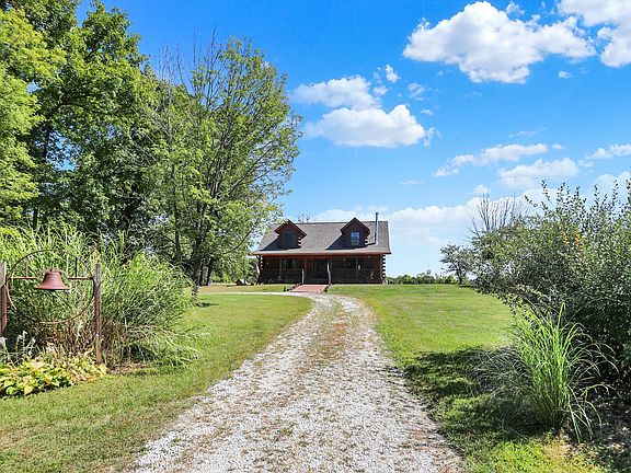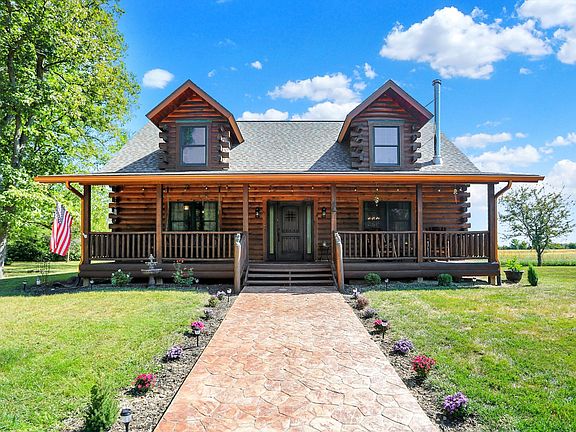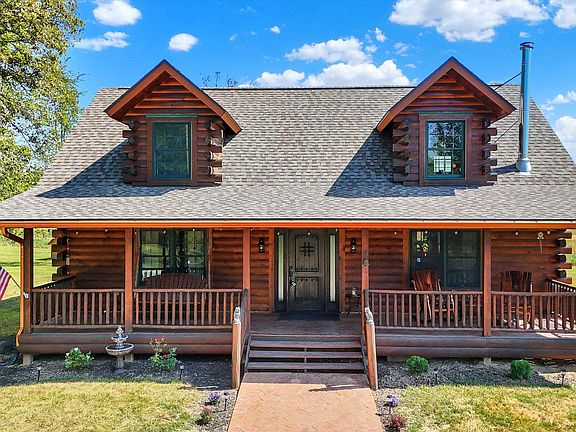 Hobby Farm on almost 10 ACRES. MOVE IN ready! Hochstetter McKay Log Home with FULL 1300 square foot basement with an egress window. Brand new 1200 square foot insulated garage/pole barn with electricity, 220V, 15' concrete approach, a work bench and concrete flooring! You can live off grid with your whole house generator, over 60 raised beds with barrier fencing, plus an overflow garden, apple trees, FULL wood shed, chicken coup and duck house both with automatic closing doors. Large storage shed and in-ground lighted trampoline! Enjoy the trails and total privacy! The home is just as impressive as the property with soaring ceilings and the floor to ceiling stone fireplace! Primary on the main floor, gourmet kitchen with high end appliances for the most discerning chef! Reverse osmosis and whole house water filtration system. Enjoy the sunroom and private rear deck. Custom heavy wood door with functioning peep door welcomes you on the covered front porch. Tastefully done with authentic finishes everywhere you look; light fixtures, window coverings, flooring, trim, bathrooms just to name a few. Loads of recent upgrades including a complete remodel of the primary bath room (flooring, custom vanity, added electrical outlets, full frameless glass shower enclosure), barn closet doors, 1/2 bathroom on the main floor. New Poly Mod Roofing and gutters-2023, Furnace-2021, A/C-2020, Water Heater-2022. All of this just with quick and easy access to Hwy 69!