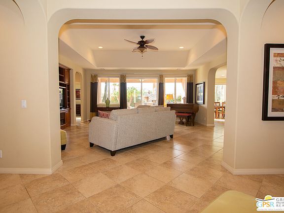 Welcome to 8567 Summit Pass, perfectly positioned on a premium elevated lot within the highly sought-after 55+ gated community of Paradise Springs. This former model home features 2 bedrooms plus a spacious office/den that offers an easy conversion to a true third bedroom, along with 3 baths across 2,338 sq. ft. of bright, inviting living space. The open-concept layout showcases high ceilings, a cozy fireplace flanked by custom built-ins, and a thoughtfully designed kitchen complete with solid-surface countertops, decorative tile accents, and a welcoming breakfast bar. A reverse osmosis water filtration system provides clean, filtered water throughout the home. Indoor living flows seamlessly into the private backyard retreat, where you'll find flagstone hardscaping, a covered patio, and a built-in BBQ ideal for both entertaining and quiet evenings under the desert sky. Enjoy stunning west-facing views of city lights and Mt. San Jacinto, creating a picturesque backdrop year-round. The primary suite opens directly to the backyard and offers a spacious bath and generous walk-in closet, delivering comfort and convenience. Paradise Springs elevates desert living with resort-style amenities, including a clubhouse, fitness center, pool and spas, BBQ/picnic areas, and secure gated access. Residents also benefit from being adjacent to Mission Lakes Country Club, featuring an acclaimed 18-hole championship golf course. With low HOA dues of just $148 per month, this home offers an exceptional blend of comfort, quality, and lifestyle. Schedule your private showing today - opportunities like this are rare.