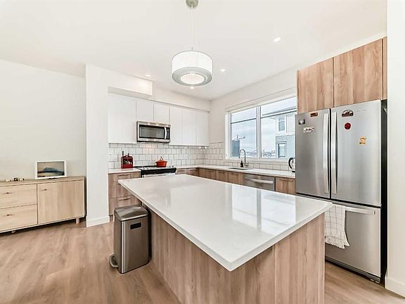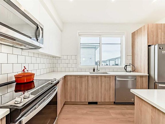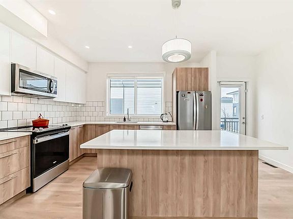 This gorgeous 2 bed, 2.5 bath townhome comes with a double attached garage and is located in the brand new master planned community of Belmont. The main level consists of an open plan with high ceilings, lovely vinyl plank flooring and large windows that bring in tons of natural sunlight. The kitchen is a chef's delight offering upgraded S/S appliances, custom cabinets, tiled backsplashes plus quartz counter-tops and a large center breakfast bar that overlook the spacious living room and separate dining area. Completing the main floor is a 2pc bath plus access to a huge 25' balcony off the kitchen with a BBQ gas line. Upstairs you will find 2 bedrooms (the most popular plan). The primary bedroom comes with a walk-in closet plus a good sized 3pc ensuite. Completing the upper floor is a 2nd bedroom plus a 4pc bath and laundry area. The ground level offers a beautiful landscaped/fenced front yard plus a large main entrance and a double attached garage with a man door. Amenities include exclusive access to the "Goodwin" outdoor living space including a park with picnic tables. Located close to schools, parks, major shopping and roadways plus a future Plaza scheduled to be completed in 2026.