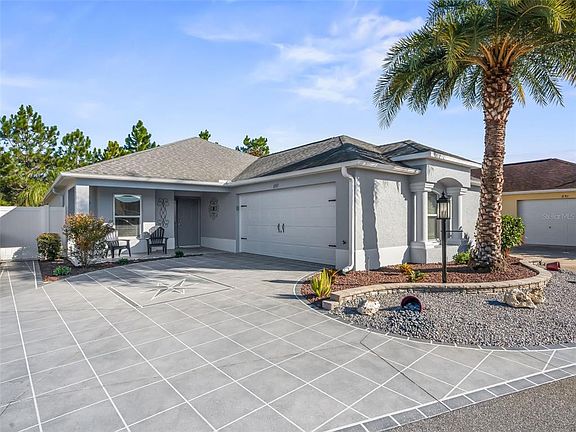 Location, Location, Location…. Easy golf cart ride to Brownwood and Lake Sumter Landing. A Beautifully maintained 3/2 Arlington model Courtyard Villa featuring 1650++ square feet of heated/AC living space, plus TWO LANAIS (first one is 200+ square feet of enclosed living space and the second one is outdoors with a birdcage and covered with a roof awning for rain and sun protection) perfect for relaxing or entertaining in any weather and a 2 CAR GARAGE. New appliances (2024), (refrigerator 2025), High End washer and dryer, New Pegasus water filtration system (2025), Updated irrigation system (2024), Updated landscaping (2024), Freshly painted interior and exterior (2025). Walk-in closet, Epoxy flooring in garage + birdcage, enclosed back yard. Ecobee Smart Thermostat (2025). The home offers an open floor plan, with luxury vinyl plank throughout (no carpet), granite counters in the kitchen with white and gray-toned wood cabinets. The Outdoors features a painted driveway and porch (with roll-down sun-screen), low maintenance landscaping with stone covering and ROOM for a pool (see design attachment with listing). The home is partially furnished (furnishings offered as a separate package). Minutes to Colony Plaza, pickleball, country clubs, golf and the Squares. A Must See, Book your appointment today!
