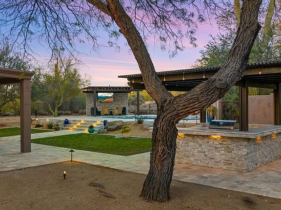 Step into luxury with this stunning property, where every detail has been meticulously crafted for your enjoyment. Nestled on a quiet cul-de-sac just under an acre with beautiful landscaping, this recently renovated home offers resort-style living and an unparalleded outdoor entertainment experience. Unwind while watching your favorite tv shows or sports games from the refreshing pool. Sharpen your golf skills on the custom putting green, and entertain guests at the bar around the covered built -in BBQ. The fully remodeled kitchen ia a chef's haven with large entertainer's island. stainless steele appliances, wine fridge, double ovens, induction cooktop. This private and tranquil retreat is conveniently located near restaurants, shopping, golf and resorts.