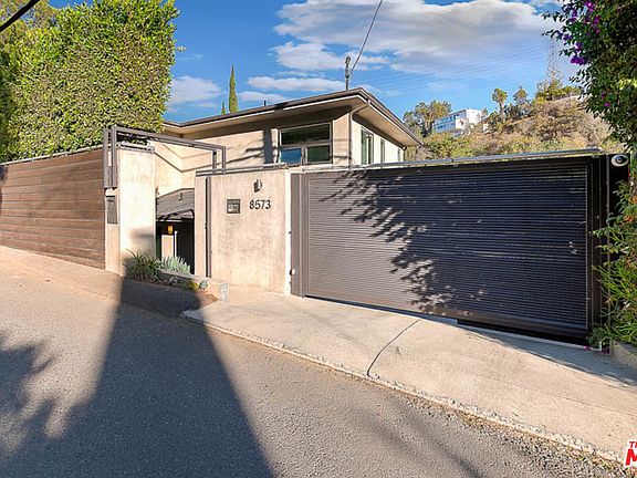 This stunning gated contemporary compound offers 2BR & den + separate office area with secluded pool/spa & serene canyon views. Grand entry with soaring ceilings leads you to an open floor plan highlighted by beautiful walnut floors, granite fireplace and sliding walls of glass allowing access to a large deck overlooking the pool, ideal for entertaining. Cook's kitchen includes granite counter tops, Walker Zanger marble backsplash, SS appliances and wine cooler. TV/den, powder room and a guest bedroom with en-suite bath complete the 1st floor. The second level opens to a loft style office with custom built-in desk, bookshelves and a cozy outdoor balcony. Sumptuous master suite is completed by dual vanity sinks, heated floors and oversized jet-tub. Exquisite imported fixtures and finishes throughout, Nuvo Audio System, entertainer's paradise pool and spa along with gated driveway, two car garage and additional off-street parking makes this a rare find in the Hollywood Hills.