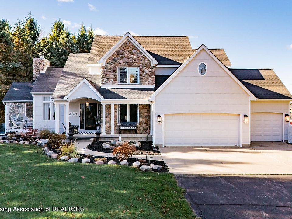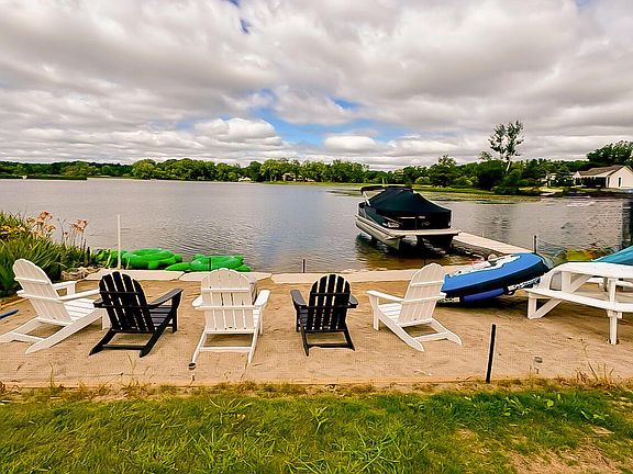 Scenic Lake. Fabulous waterfront home on this rarely available distinguished private All-Sport's lake! With this home, the lake life is not just for weekend travel, this is every day, four-season, lake living at its best! Scenic Lakes' well-kept secret is it suits both the desire for a quiet view and an active lake lifestyle, such as swimming, boating, ice skating and hockey, plus great fishing to name a few. Nestled off the road with approximately 1.8 acres with views galore, this cottage and home in one is truly special with its craftsman design both inside and out. The front porch is welcomingly accented with shaker shingles leading to the dramatic foyer and great room including special ceiling heights and amazing beam work, anchored by a floor to ceiling stately stone fireplace. Enjoy access to a covered porch with a stone wall-an amazing space including special lighting to relax and catch a sunset or sunrise all year. The porch converts to a cozy igloo inspired winter retreat with custom panels and overhead heating - perfect for sipping a warm beverage while admiring the snowfall surrounding you. The kitchen is stunning and a great gathering place including a bay window and door, center island, loads of cabinets, granite countertops, stainless-steel appliances plus a special multi use serving center with custom live edge wood counter top, dual temperature zone beverage refrigerator plus an amazing tiled back splash and a pantry too! Flex space with a 1st floor study or formal dining or extra guest sleeping quarters! Great drop zone and first floor laundry off the 3-car garage with additional overhead storage plus a service door. The newer patio, steppingstone walkway and garden area are made for outside living with a built-in custom fire pit plus a putting green! Meander to the lake with a gorgeous and amazing sandy beach and two docks! Plenty of play area space with the large green grass area overlooking Scenic Lake. Three bedrooms on the second floor. The primary bedroom has fabulous water views, a walk-in closet plus a stunning new bath which includes two vanities and a designer shower for two including a transom window, euro door, and dreamy 2'x 3' tiles. The other two bedrooms are generous in size, one viewing the beach and the other with beautiful front lawn landscaping and tall evergreen trees. Partially finished lower level with nice high ceilings! Excellent extra space or exercise alcove. Nestled in a desirable area and established neighborhood. Enjoy "beyond amazing" 4th of July holiday celebrations on the lake: fireworks, volleyball tournament, corn hole tournament, kids' bike parade, bass tournament, picnic, and more! Enjoy the sunset from your beach or on a cruise! See attached list of upgrades (over $80K since ownership) and come live the dream! Seller reserves: All TV's, Flex Room gold frame mirror, washer/dryer, and paddle (hanging from beam).