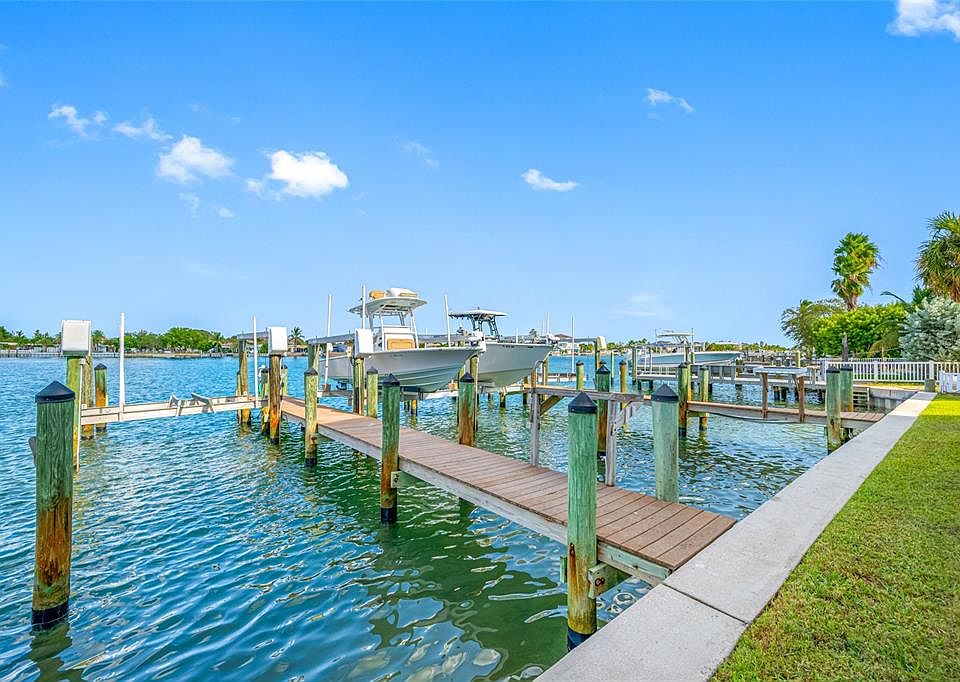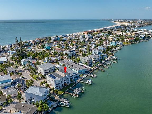 WATERFRONT ELEGANCE IN SUNSET BEACH. Welcome to your slice of coastal paradise in the exclusive Sunset Beach community, located at the serene southern end of Treasure Island. Tucked away in a small, private enclave along the tranquil Blind Pass Waterway, this spectacular waterfront townhome offers the perfect blend of luxury, leisure, and lifestyle. Step outside to take in breathtaking intracoastal views, where the glistening waters of Blind Pass lead directly—without obstruction—to the Gulf of Mexico. From your private 50-foot dock and deeded boat slip with a 4,000-pound lift, every day is a new opportunity for adventure on the open water. The ground-level paved patio is the ideal place to unwind with morning coffee or evening cocktails, all while overlooking the gentle ripples and passing boats with frequent dolphin sightings. Just a few walkable blocks from iconic Sunset Beach, this home captures the essence of Florida coastal living at its finest. Step inside this beautiful three-story townhome and prepare to be impressed. The ground-level garage is not just functional but thoughtfully finished, featuring decorative epoxy flooring, built-in storage, and convenient pulleys for bikes and gear. The private elevator provides access from the garage to second & third floor areas. On the first living level, French doors open to a versatile fourth bedroom or office suite, complete with its’ own private entrance and full bath—perfect for guests, remote work, or an in-law setup. Ascend to the main living area, where open-concept design and timeless craftsmanship shine. The living, dining, and kitchen spaces flow seamlessly together, framed by plantation shutters, crown and dental molding, and engineered hardwood floors that add warmth and sophistication. The balcony just off the family room is perfect for taking in the waterfront breezes in addition to the blue/green colorscapes. The kitchen is a culinary delight, featuring solid wood custom cabinetry, granite countertops, and thoughtful details that make every meal a pleasure. The top floor hosts the home’s private quarters, including a luxurious master suite designed to capture the waterfront panorama with wraparound windows that invite in both sunrise and sunset views. The en suite bath is a true retreat, complete with a jetted soaking tub under a picture window, a separate oversized shower. A generous walk-in closet completes the primary suite. Two additional bedrooms share a well-appointed hall bath with tub, shower, and elegant finishes, while the laundry room is conveniently located nearby. From the thoughtful custom details throughout, every element of this home reflects quality and care. This Sunset Beach waterfront residence offers not just a home—but a lifestyle. With unobstructed Gulf access, refined interiors, and a setting that celebrates the beauty of Florida’s Gulf Coast, it’s the perfect place to live where every day feels like a vacation.