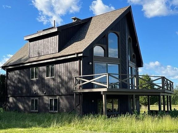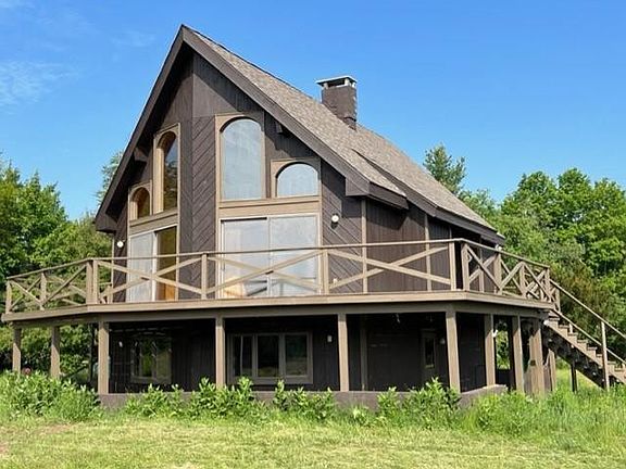 SPECTACULAR MT VIEWS!! Five brm (3 upstrs, 2 dwn). Chalet style w/ long private set-back has recent renovations including new roof, well pump, wd flooring, refinished knotty pine ceilings,walls, flrs; & lighting. VT Castings wdstoves w/ fieldstone hearths on main level & fin bsmt. Open dining area & LR. Below grade area is elevated w/ grade level entry, lg view windows & high ceilings. Patio at the lower level, large wrap deck at the upper level; both oriented to views. Location is appx 2 mi from Union Falls & 4 mi from Franklin Falls canoe/kayak launches for paddling & fishing for Walleye, Bass & Pike. 30 min from Whiteface Mt. Lg front field would be great for horses. Detached 2 Car garage (24 x 32) is heated & insulated. Owner will provide a credit for Starlink Satellite internet equipment for faster connectivity w/ lower monthly fee than other providers.