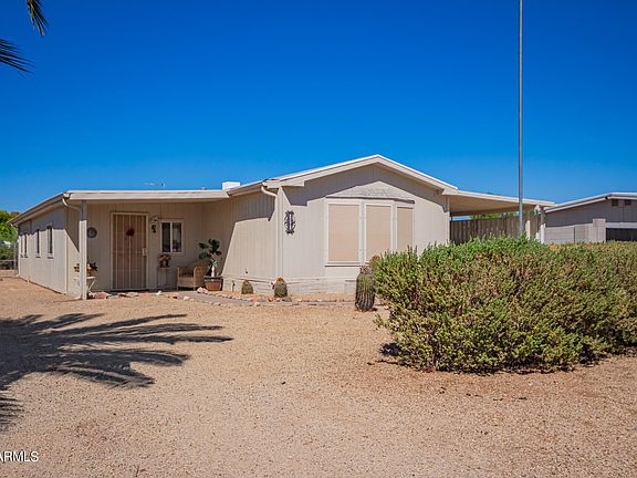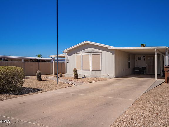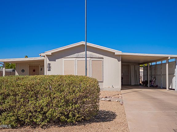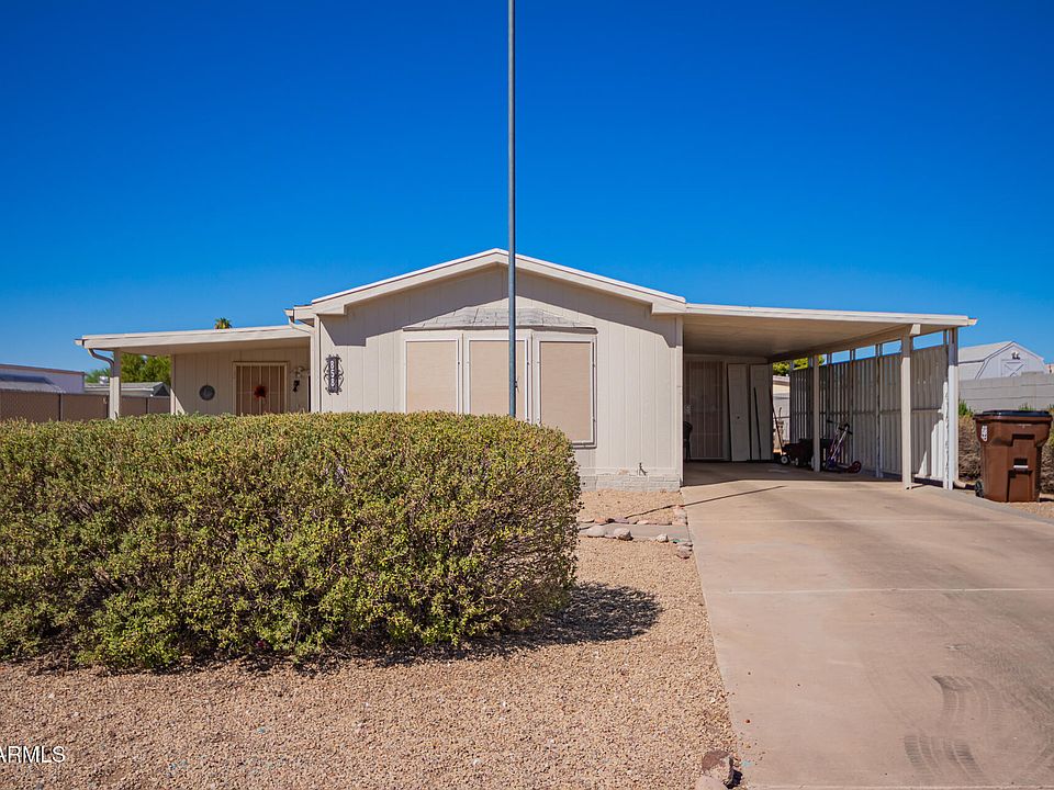 Seize the opportunity to own this affixed mobile home now available! This gem displays desert landscaping, carport parking, and an inviting front porch for your morning coffee. Be greeted by a sizable living room filled with natural light and ceiling fans for intimate gatherings. The home exudes charm with its soothing paint, vaulted ceilings, and wood-style flooring. The eat-in kitchen is equipped with wood cabinetry, lovely light fixtures, enough counter space for meal preparation, and a breakfast bar. Make the bonus room into an office or an additional living space! This gem offers three cozy bedrooms and two bathrooms for privacy and comfort. Detached guest quarter has soft carpeting & a laundry room. The large backyard with covered patios is excellent for outdoor activities! NO HOA!