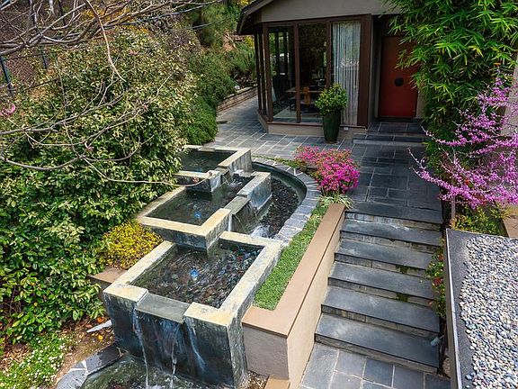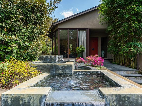 This Neutra-inspired modernist post and beam home is located in the prestigious San Rafael area of Pasadena. Originally designed in 1948 by the architectural firm of Charles Lindstrom,the home has since been remodeled to perfection. Skylights abound, flooding the home with natural light. Nearly every room boasts large expanses of glass doors and windows, framing views of prize winning gardens, creating a serene indoor/outdoor feel that starts in the expertly designed and decorated living room, and flows into the Cynthia Bennet-designed kitchen. The light filled dining room perfectly frames a view of the multi-level fountain sitting at the gated entry, designed by renown Japanese landscape architect, Takeo Uesugi. Beautiful and unique custom cabinetry can be found throughout. A spacious master suite on the first level offers a walk-in closet and a beautifully remodeled bathroom, featuring penny tiles and a steam shower. Glass walls and French door lead to a private patio (one of many that can be found on all sides of the home) completing the Zen-like feel of the suite. The original gardens, including two fully functioning fountains, were designed by famed mid-century landscape architect, Garret Eckbo. The gardens were refurbished in 2004 by Takeo Uesugi.