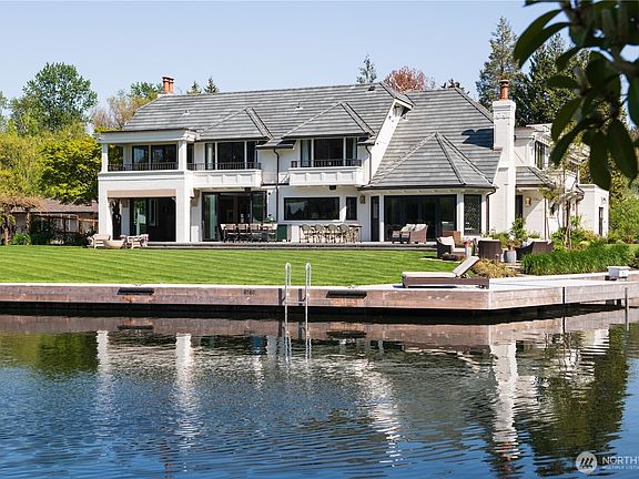 Reimagined English Tudor nestled on the west-facing shores of Lake Washington.Double doors open to two story entry with bespoke iron railings & gorgeous stone floors mined in Ireland.Formal living & dining rooms with oversized French doors to bluestone patio, huge lawn, fire pits & calming water views.Study with cashmere walls, lacquered trims and bookcases.Kitchen/Great room with fireplace, stunning marble & Ann Sacks terra cotta tile finishes and blue Lacanche range.Primary room w/antique fireplace & Calacatta marble bathroom. Hand-cut herringbone white oak floors. 123 ft of waterfront-new bulkhead/dock/platform lift for the boating enthusiast.5 Beds, 5.5 Baths.Gym.Park-like setting with gated drive. Do not miss the pickleball court!