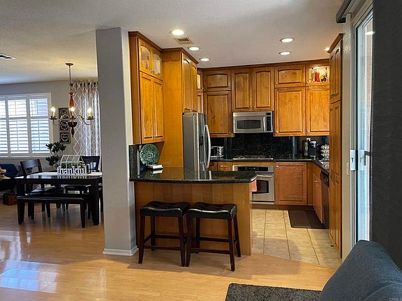 First time on the market and located in the gated community of Mesa Cove, these homes are rarely available. Pride of ownership shines throughout this updated and spacious home with high vaulted ceilings. Ample windows brighten the home with plantation shutter and built-in cabinets. Cabinets in the kitchen, bathrooms, and linen were all replaced with Birch hard wood. Kitchen has been fully renovated with stainless steel appliances, gas stove, several pull out drawers and Lazy Susan cabinets, lighted cabinets, and granite counters. Downstairs has wood laminate flooring. The stairs and upstairs have been updated to Pergo flooring in June 2022. Serene backyard with $30,000 of recent updates: New colored stamped concrete, new drains, new landscaping, and a new patio cover with recessed lights. Tons of storage with built-in cabinets on every wall in the garage. Centrally located and within walking distance to schools, public transportation, Mira Mesa Community park, and shopping.