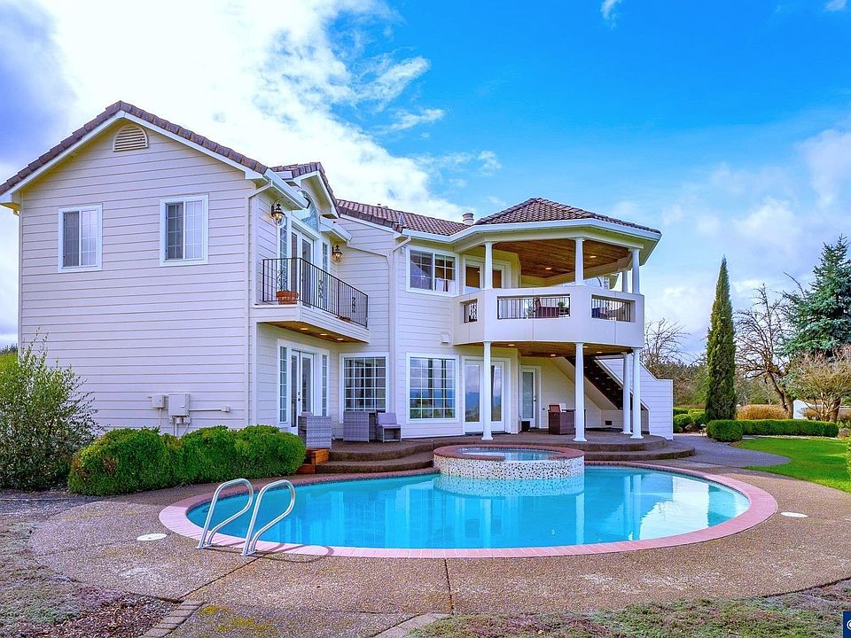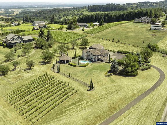 Escape the Ordinary - Discover a Vineyard Retreat with Views! Perched above the quiet hills of Amity, this one-of-a-kind estate is more than just a home, it’s a destination. Designed for those who dream of a slower, richer, more creative lifestyle, this Mediterranean-inspired retreat offers panoramic views, sunset evenings by the pool, and the chance to craft your own wine right from your own backyard, wine making equipment included. Set on 4.85 scenic acres, the estate welcomes you with fresh new siding and paint in March 2025, multiple garage bays (or flexible creative spaces), a sparkling in-ground pool, and a charming gazebo with wood-burning fireplace and pizza oven, perfect for alfresco evenings with friends and family. Every room is filled with light, opening onto covered terraces and balconies that invite you to slow down, take in the hillsides, and enjoy the serenity that only country living can offer. Inside, the spacious layout allows for both elegant entertaining and comfortable daily life. The open kitchen includes a new refrigerator and dishwasher and flows easily into formal and casual living and dining areas. The primary suite feels like a luxury hotel getaway, complete with a private balcony, jetted tub, walk-in shower, and walk-in closet space. Downstairs, guests (or multigenerational living) are thoughtfully accommodated with auxiliary bedrooms and a large living room featuring a wet bar. And the dedicated wine studio? It’s already inspiring its next vintner. The vineyard and cherry orchard are ready for your vision, whether that’s producing your own label, planting new varietals, or simply enjoying the rustic charm they bring to your backyard. If you’ve been craving more space, more sky, and more purpose and the most amazing sunsets, this property is your invitation to dream bigger. Located just outside of McMinnville and Linfield University, it offers a true retreat from the bustle, with flexible living spaces, a legacy feel, and room to grow.