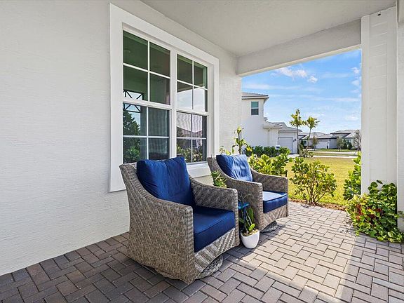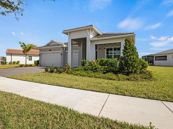 Welcome to this 2024 3-bedroom, 3-bath home with a 3-car garage, EV charging outlet and peaceful lake views in the highly sought-after PGA Verano community. Perfectly positioned on an oversized lakefront lot, this home offers a desirable east-facing lanai for sunrises and a west-facing front porch for gorgeous evening sunsets--blending beauty, comfort, and function in every detail.Step inside to discover elegant marble tile flooring throughout the main living areas, complemented by wood-like tile in the owner's suite and guest bedroom. The chef's kitchen is a showpiece with Thermofoil cabinetry, quartz countertops, and premium appliances including a 36'' induction cooktop and under-cabinet lighting for added warmth and style. The open great room and dining area overlook the tranquil lake, creating an inviting space for entertaining or relaxing. The spacious owner's suite features upgraded cabinetry, an automatic remote-controlled window shade, and a convenient laundry room walk-through directly to the custom walk-in closet. Bedroom #2 is an ensuite with a full bathideal for guests or multigenerational living. Additional highlights include a 4' extended garage, epoxy-coated garage floors, and thoughtful smart-home touches throughout.