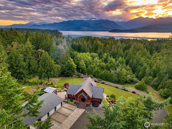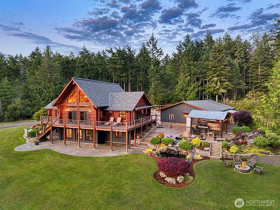 One of a kind, Seabeck oasis! A wonderful, impeccably maintained 3170 sq ft LOG home with stunning Olympic Mountain views on 5.7 acres of beauty and solitude! What else? Oh, so much more! Best to see for yourself, but here are some vitals: Three bedrooms, 2 3/4 baths; primary on main, full bath w/ jetted tub with view! Office on main; generously updated kitchen featuring beautiful quartz counters. Wonderful living room with additional loft for comfort and privacy. Low maintenance propane fireplace on main, heat-boosting wood stove downstairs. Stately luxury vinyl through the main and low maintenance surface below. Huge 4 bay garage, including one oversized for boat/RV storage; also with separate work shop area.