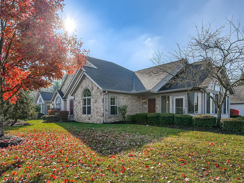 Beautiful Abbey model in the much sought after complex of Villas at Riverbend featuring 2 bedrooms, 2 full baths, and a bright three-season sunroom with amazing views. Enjoy an open floor plan with cathedral ceilings, a spacious living area with a tile surround gas fireplace, well-appointed kitchen, generous bedrooms, and an attached 2 car garage with ample attic storage. This single-story condo offers low-maintenance living with access to fantastic community amenities including a fitness center, clubhouse, and pool. Conveniently located near shopping, dining, and walking paths. The side yard provides lots of private green space you can enjoy form the sunroom. Many updates include new gutters in 2025, new driveway in 2021, new roof in 2012, new AC in 2016 and new furnace/AC circulating fan & capacitor in 2017.