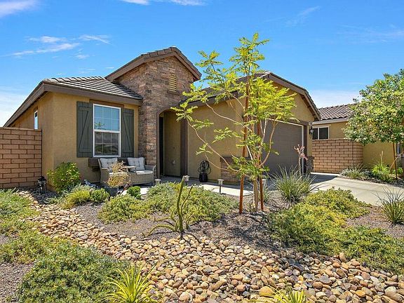 New flooring! Freshly painted! Exceptional Value in a Premier 55+ Resort Community! Don't miss this gorgeous 2021 French Elevation-style Black Hill floor plan tucked into a peaceful cul-de-sac. Offering 1,555 sq. ft., 2 bedrooms, 2 bathrooms, a bonus/den room, and a wide array of premium upgrades, this home is designed for comfort, style, and functionality. The chef's kitchen is a standout with thick granite countertops, a 6'' backsplash, white cabinetry, large island with bar seating, GE gas range with convection oven/air fryer, upgraded dishwasher, and a spacious pantry with pull-out shelves. The open-concept living area flows to a private patio with flagstone pavers, perfect for relaxing or entertaining. (Pavers are sand-filled, allowing for easy redesign.) Enjoy a king-sized primary suite with a large walk-in closet and spa-style bath with a walk-in shower and Delta snap-in handheld fixture. Other highlights include double doors to the bonus room, an extended front cement patio & side walkway, low-maintenance landscaping, and solar with a low $93 monthly payment for excellent energy savings. Premium $8,000 lot upgrade with unobstructed views (land behind owned by Coachella Water District). Extra electrical/data outlets in guest and den rooms for remote work setups, plus ceiling wiring for hanging pendants in the kitchen. Located just minutes from dog parks and the amenity-rich clubhouse, offering indoor/outdoor pools, tennis, pickleball, bocce, basketball, a fitness center, an aerobics studio, a ballroom, a beauty salon, and more! Bring your offers--this is resort-style living at its best! Wells Fargo Assumable Loan: 2.875% interest rate. Call for details.