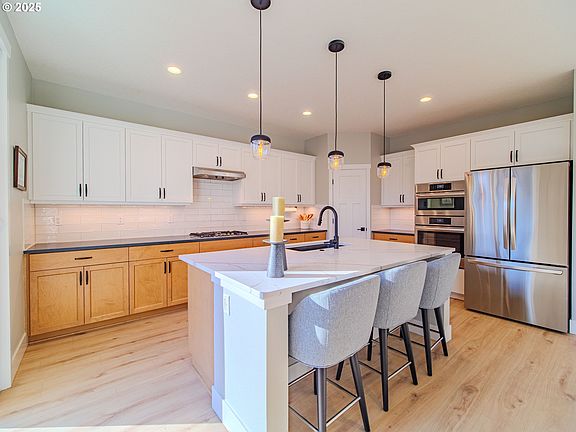 Stunning Riverside-built contemporary in sought-after South West Hills! This modern home offers exceptional craftsmanship, thoughtful upgrades, and a bright, inviting atmosphere. Nestled in a peaceful setting with no neighbors to the east, this residence enjoys a spacious, versatile living space and an abundance of natural light. The gourmet kitchen is designed for entertaining, featuring high end Bosch stainless steel gas appliances, two-tone cabinetry, under-cabinet lighting, soft close drawers with upgraded pull outs, quartz countertops, a large island, built-in oven and microwave/convection oven, gas cooktop with range hood, and a pantry. The living room showcases expansive windows, a gas fireplace with built-ins, and luxury vinyl plank flooring that extends throughout the main level. With five bedrooms plus a spacious loft, this home provides incredible flexibility. The main level bedroom and full bathroom offer convenience for guests or multigenerational living. Upstairs, the primary suite features French doors, double sinks with quartz countertops, a soaking tub, walk-in mud-set shower, and a large walk-in closet. Additional highlights include A/C, custom remote blinds, ample lighting throughout, and a Ring doorbell camera (2023). The laundry room includes a utility sink and built-in storage. The fully fenced, South-facing backyard offers low maintenance landscaping and a sunny patio, perfect for outdoor dining or morning coffee. Located minutes from HWY 26, shopping, dining, and parks, this home is the perfect blend of privacy, quality, and convenience!