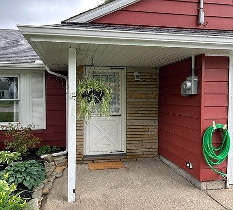 Sharp ranch design. Covered, front entry with stone accents. Dimensional shingle roof with chimney wrapped in stone. Driveway is wide enabling maneuvering of vehicles. Fenced-in rear yard with small shed for mower and yard tools. Attached garage facilitates laundry with washer & dryer included ... man door, automatic garage door opener, shelving & scuttle access to attic storage space. Charming kitchen is spacious and open to the dinette area ... vaulted ceiling with two skylights, rough-sawn wood beam and rough-sawn accents, stone hearth and wainscot, recessed/can lights, slate floor, ample oak cabinetry and appliances included. Generous sized living room with nice entry and coat closet. Ceiling fans in all three bedrooms. Remodeled bathroom. Several recent updates/improvements ... newer garage overhead door, hot water tank, storm door, garbage disposal and replacement windows. Professional roofing work recently completed. Ductwork professionally cleaned. A neat, clean and orderly hom
