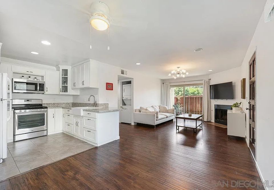 Welcome to this beautifully upgraded downstairs condo, offering 2 bedrooms and 2 bathrooms in a bright, open layout designed for both comfort and style. The kitchen shines with granite countertops, custom cabinetry, and ample workspace for everyday cooking or entertaining. The inviting living room is anchored by a cozy fireplace and flows seamlessly onto a private patio—perfect for morning coffee or evening relaxation. Inside, you’ll find rich laminate flooring, upgraded windows that fill the space with natural light, and a convenient in-unit laundry closet with a stacked washer and dryer. Both bathrooms have been fully remodeled with fresh, modern finishes that create a spa-like feel. The oversized primary suite is a true retreat, featuring a custom built-in wardrobe system with thoughtfully designed cabinets and drawers for maximum storage and organization. This home also includes a private attached garage with direct entry into the residence, plus TWO additional community parking spaces—an excellent combination of convenience and security. The community offers resort-style amenities, including a sparkling pool and a relaxing spa. The location is ideal: just off the 805 freeway, providing easy access to the highway, shopping, dining, and everyday conveniences. Move-in ready and thoughtfully updated, this condo perfectly blends comfort, convenience, and modern style—don’t miss the chance to make it yours!